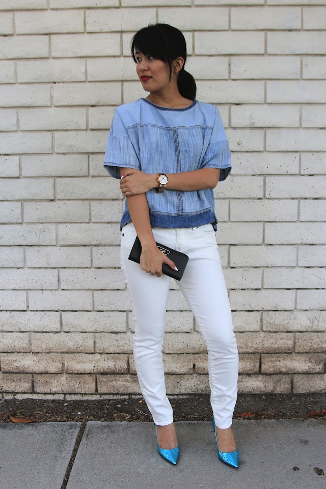 Happy Monday All! This Zara denim top was another acquired item during my stay in Mexico. Looks like I'm working my way down this list. I wanted to stick to the theme of blues (since I'm missing my love terribly) so I finished this ensemble with my turquoise Choos - I figured if I did a denim or navy bottom it would be blue overload. Anyway, I have a pretty busy Monday in the lab so I'll cut this short. Have a good one!